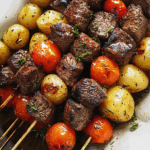 Probably one of my favorite kebabs, these Rosemary Garlic Steak Kebabs are loaded with flavor, perfectly cooked, and a hit with the entire family! Tender and juicy steak, marinated tomatoes, and seasoned potatoes, grilled to absolute perfection—what is not to love!? Perfect for summer barbecues or cozy family dinners, this dish brings together fresh ingredients and aromatic herbs that will tantalize your taste buds.
