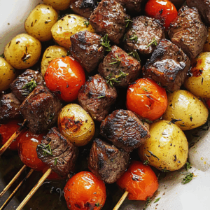 Indulge in the mouthwatering goodness of Rosemary Garlic Steak Kebabs, a family-favorite dish that promises to elevate your dining experience. Marinated in a delightful blend of balsamic vinegar, honey, and aromatic garlic, these kebabs feature tender sirloin cubes, juicy grape tomatoes, and seasoned baby potatoes grilled to perfection. Ideal for summer barbecues or cozy family dinners, they bring together fresh ingredients and vibrant flavors that will tantalize your taste buds. Quick to prepare and easy to customize with your favorite vegetables, this recipe is sure to impress at any occasion.